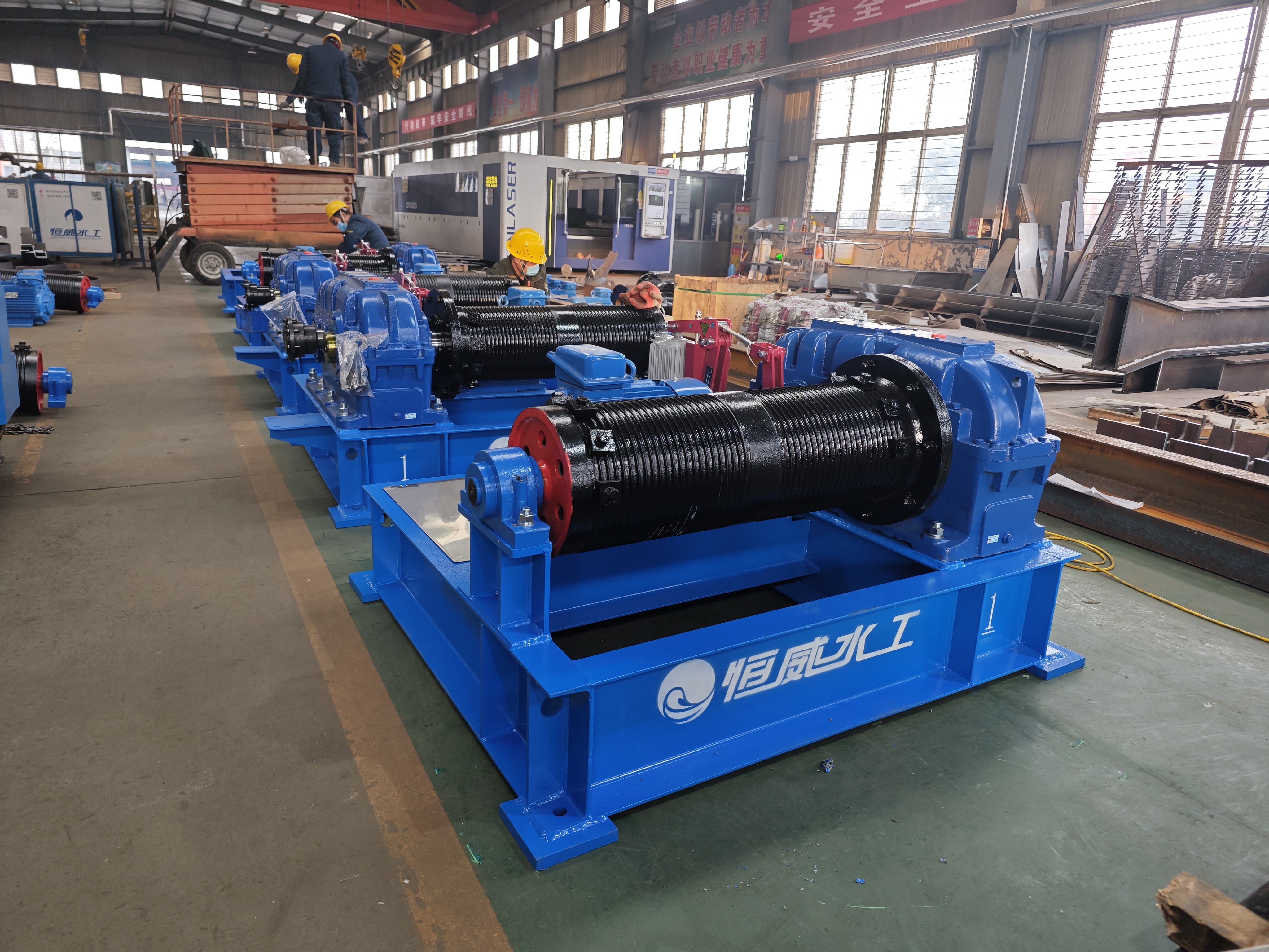 卷扬式启闭机用于依靠自身重量闭门力的平面闸门。该产品主要由电动机、联轴器、传动轴、减速器、交流制动器、开式齿轮、卷筒部分、滑轮系列部分、电器控制箱、负荷控制器、手摇器及机架组成。结构紧凑,承载能力大,运行平稳可靠,安装维修方便,设计合理。可配装手摇装置,固定式、移动式、单、双吊点卷扬式启闭机。